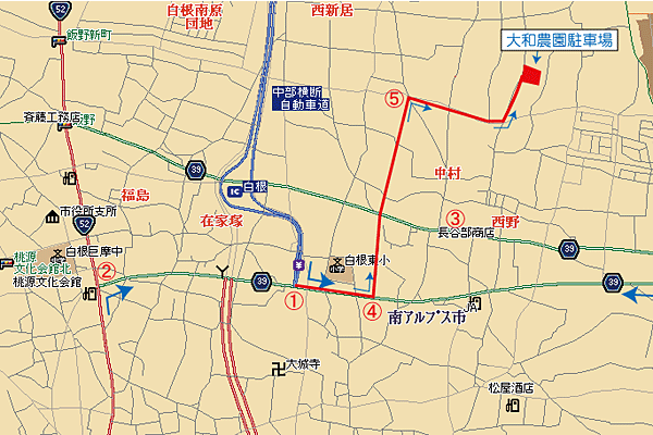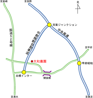 ※静岡方面より 新国道52号線を北に進み、白根IC入口の交差点(消防白根分遣所)を白根ICを目指して右折します。 以下、東京方面よりを参照してください。
